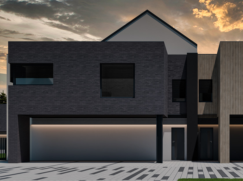 W projekcie zastosowano starannie dobrane materiały, które łączą trwałość z nowoczesną estetyką. Fragmenty elewacji zdobić będzie klinkier, nadający budynkowi elegancki i ponadczasowy charakter. Uzupełni go materiał ceramiczny imitujący drewno, wprowadzający naturalne, ciepłe akcenty. Całość dopełnią tynki w odcieniach szarości, tworzące spójną, stonowaną kompozycję, a stolarka okienna i drzwiowa w kolorze antracytowym podkreśli nowoczesny styl oraz harmonijnie współgra z pozostałymi elementami wykończenia.