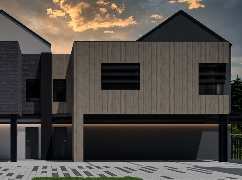 W projekcie zastosowano starannie dobrane materiały, które łączą trwałość z nowoczesną estetyką. Fragmenty elewacji zdobić będzie klinkier, nadający budynkowi elegancki i ponadczasowy charakter. Uzupełni go materiał ceramiczny imitujący drewno, wprowadzający naturalne, ciepłe akcenty. Całość dopełnią tynki w odcieniach szarości, tworzące spójną, stonowaną kompozycję, a stolarka okienna i drzwiowa w kolorze antracytowym podkreśli nowoczesny styl oraz harmonijnie współgra z pozostałymi elementami wykończenia.